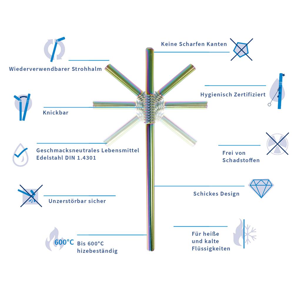 Der Strohhalm ist aus hochwertigem Edelstahl gefertigt und dadurch nicht nur lebensmittelecht sondern auch spülmaschinenfest. Jedes Trinkhalm-Set beinhaltet außerdem eine spezielle Reinigungsbürste, mit der sich der Mehrweg-Strohhalm auch ohne Spülmaschine leicht und rückstandslos reinigen lässt.