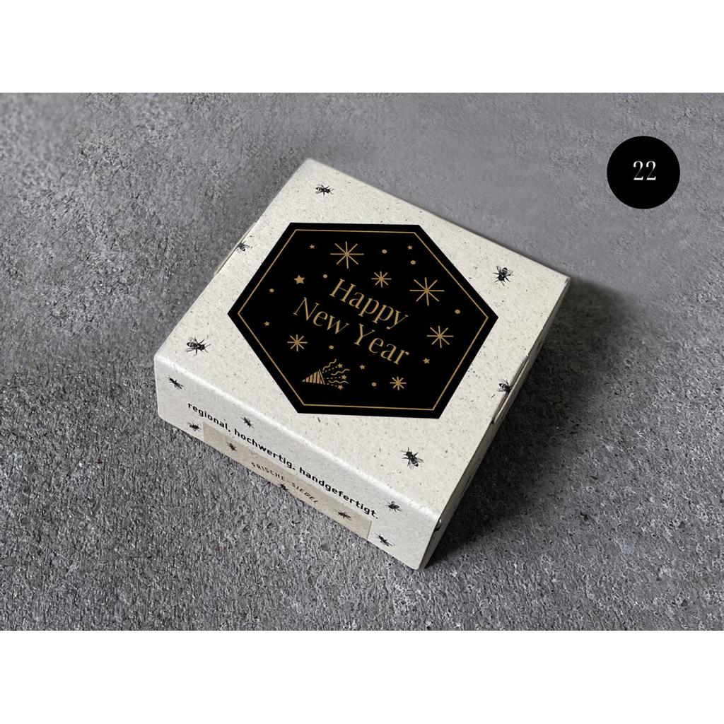 Die Füllung besteht aus cremigem, leicht herbem Lindenblütenhonig angereichert je nach Sorte mit natürlichem Minzöl, Zimt, Kaffeepulver, Zitrone oder Haselnussmark. Die Pralinen entstehen in einer regionalen Pralinenmanufaktur in regionaler Handarbeit und werden plastikfrei in nachhaltiger Verpackung inkl. Etikett aus Graspapier, geliefert. Die feierliche Silvester-Edition ist eine perfekte, kleine Aufmerksamkeit, um Ihre Kunden, Kollegen und Geschäftspartner im neuen Jahr zu begrüßen.