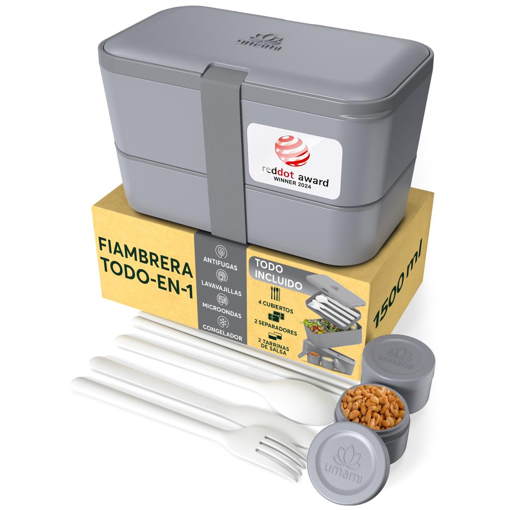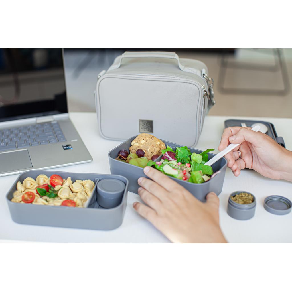 Das clevere, zweiteilige Nestable-System spart Platz im Schrank, wenn die Box leer ist, während beide Ebenen gemeinsam genügend Raum (ca. 1.500 ml) für eine vollwertige Mahlzeit bieten. Zwei verstellbare Trenner und zwei auslaufsichere Saucendosen sorgen für strukturierte Organisation der Speisen, ganz nach Bedarf. Das praktische vierteilige Besteckset (Gabel, Löffel, Messer und Essstäbchen) rundet das Paket ab.