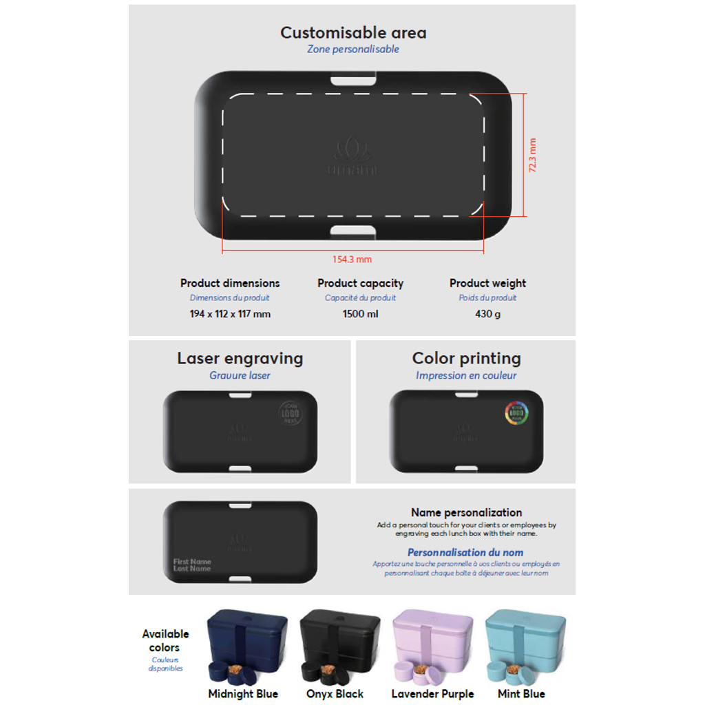 Dank 100 % auslaufsicherer Silikondichtung, Spülmaschinen-, Mikrowellen- und Gefrierschrank-Tauglichkeit begleitet diese Box Ihre Mitarbeiter oder Kunden mühelos durch den Alltag – ob im Büro oder auf Reisen. Mit Co‑Branding-Option wird die Bento Box zu einem hochwertigen, personalisierbaren Geschenk, das Stil und Funktionalität perfekt vereint.