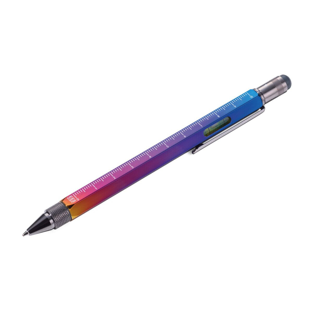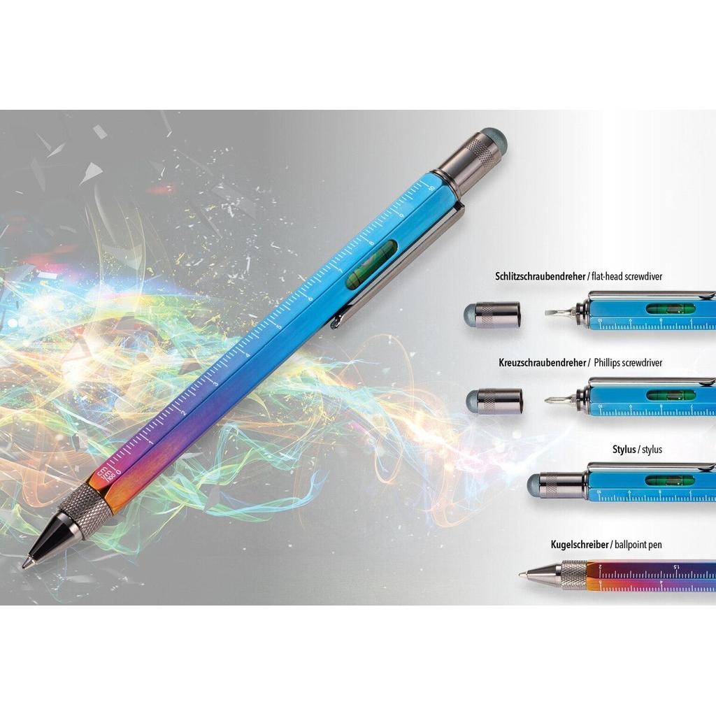 | Details: | Multitasking-Kugelschreiber , Zentimeter/Zoll-Lineal, 1:20 /1:50 Skala, Wasserwaage, Schlitz-/Kreuzschraubendreher, Stylus, schwarze Mine |