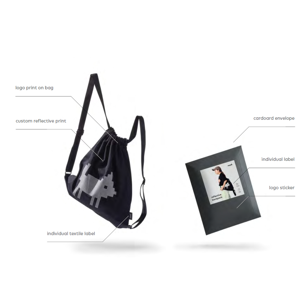 Individuelle Gestaltungsmöglichkeiten: Auf dem Rucksack: Logo-Print, personalisierter reflektierender Print oder individuelles Textil-Label. Auf der zugehörigen Verpackung: Individuelles Design oder Logo-Sticker.
