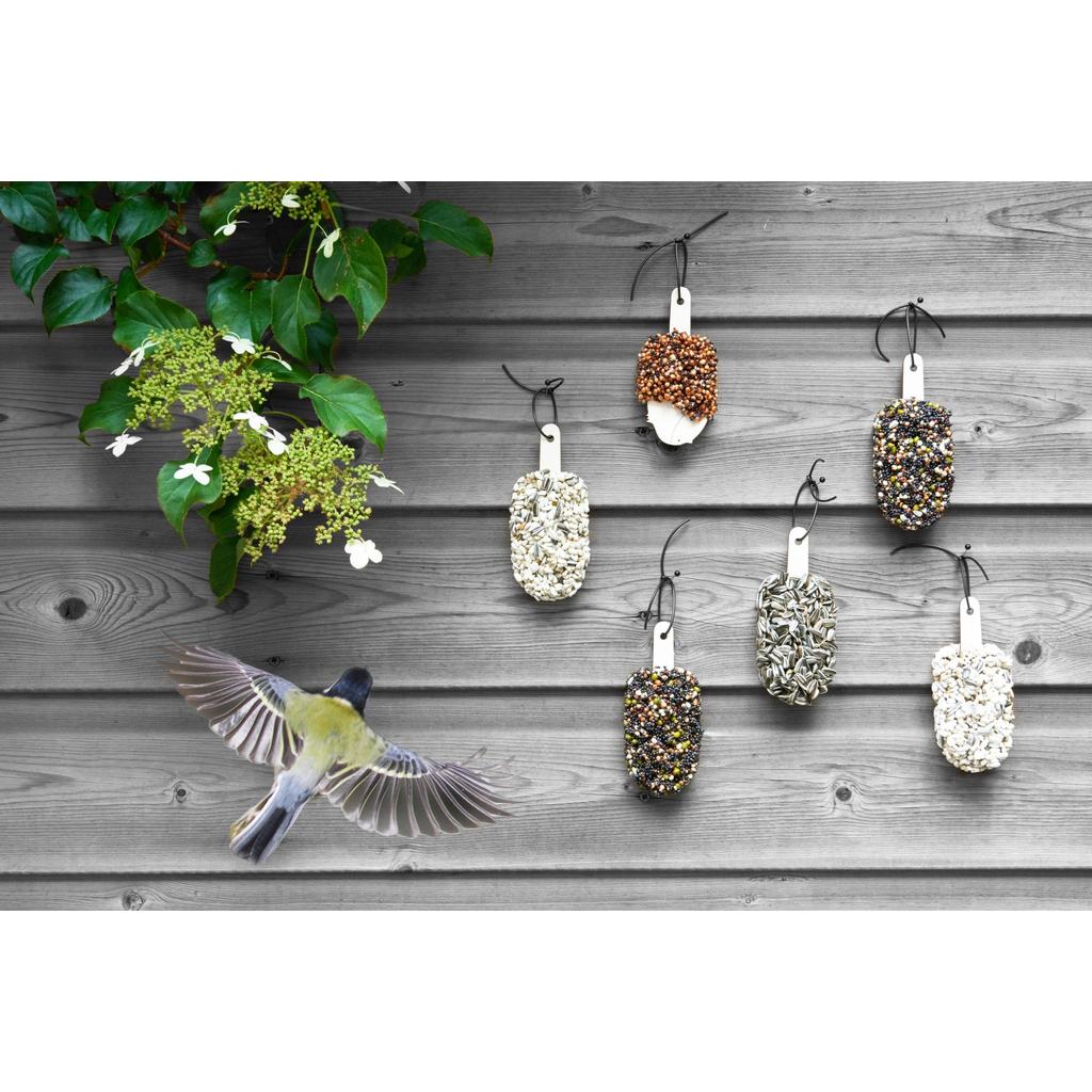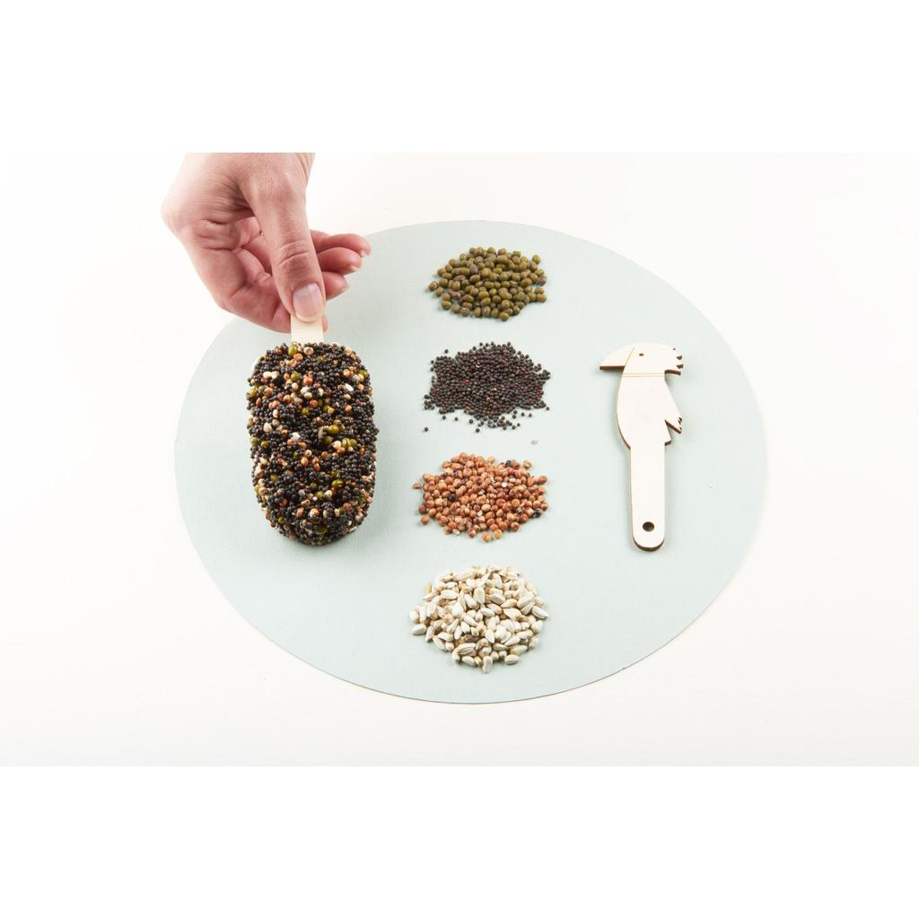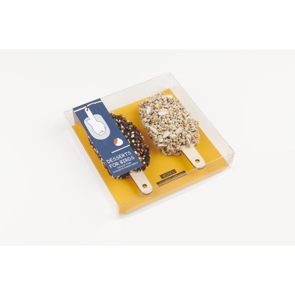 Diese Delikatesse ist in verschiedenen Geschmacksrichtungen erhältlich (s. Varianten), jede mit einer speziellen Samenmischung, die unterschiedliche Vogelarten anlockt. Ist das Dessert aufgegessen, kommt eine originelle Überraschung ans Licht: Der Eisstiel ist in Gestalt eines Rotkehlchens, einer Kohlmeise oder eines Sittichs geformt.