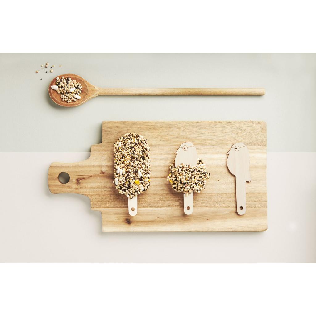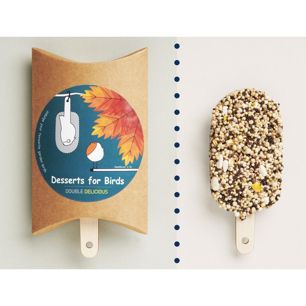 Diese Delikatesse ist in verschiedenen Geschmacksrichtungen erhältlich (s. Varianten), jede mit einer speziellen Samenmischung, die unterschiedliche Vogelarten anlockt. Ist das Dessert aufgegessen, kommt eine originelle Überraschung ans Licht: Der Eisstiel ist in Gestalt eines Rotkehlchens, einer Kohlmeise oder eines Sittichs geformt.